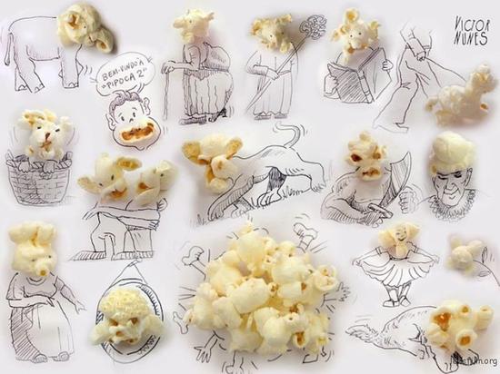 据美国《普莱诺明星信使报》报道,大约28年前,一天晚上,卡伦伯格和妻子像往常一样,坐在家中的沙发上吃爆米花。忽然,卡伦伯格发现了一个形状奇特的爆米花,像个大猩猩。于是,他拿出圆珠笔,按照自己的想象给爆米花“化妆”,把小小的爆米花变成了栩栩如生的迷你大猩猩。从此,他一发不可收拾,走上了爆米花艺术家之路。
