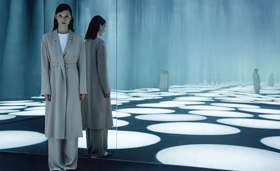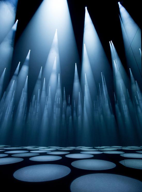 著名的日本建筑师藤本壮介(Sou Fujimoto)展出了一个大规模互动性灯光装置,名为‘forest of light’(光之林),本装置采用动态的声音和光探讨了互动与透视的概念。在黑暗的空间中我们看到从天而降的锥形光束直射在地板上,整个室内四壁安装着镜子,锥形光束呈现无限延伸的状态,看去就像一片无尽的森林,落在地上的光形成一个个圆形的大光斑,为游客们的到访增加了更多的乐趣和探索性。对于建筑师藤本壮介来说,光与游客的相互作品创造了时尚之间的纽带,用建筑的形式将森林的概念置于空间之中,也起到了令人惊讶的效果。