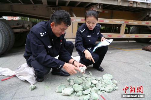 1月12日上午,海口海关召开新闻发布会,通报近日捣毁的4团伙走私近20亿元人民币宝石大案。据悉,该案20名主要目标嫌疑人全部到案,现场查扣琥珀、查罗石、玉石等各类原石及成品近60吨。海口海关相关负责人表示,上述案件是近年以来中国海关缉私部门查获的案值最大宗走私进口宝石案。图为海关缉私警察查验走私宝石原料现场。