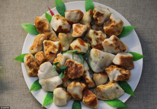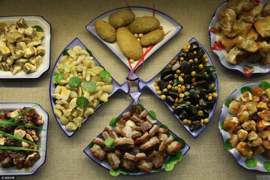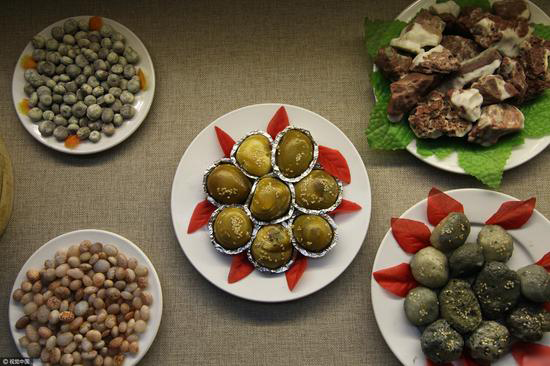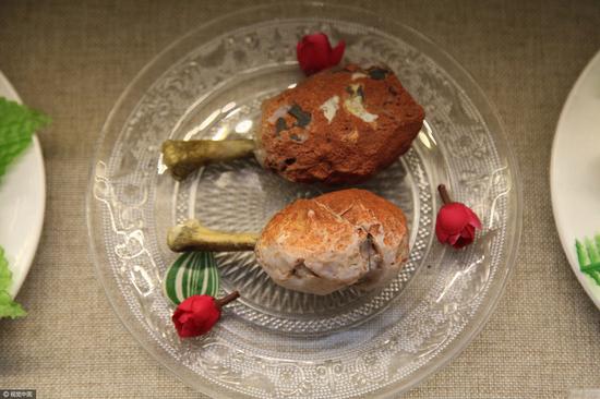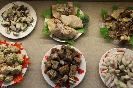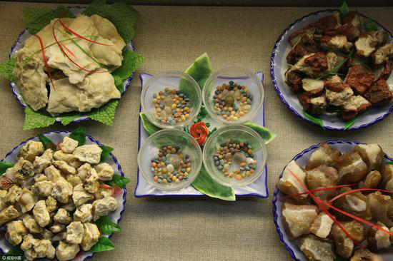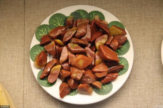 2017年4月29日,新疆哈密博物馆展出用天然石头组成的菜品,形色逼真的“石头宴”,五花肉、卤猪肝、酱肘子、烧海参……满桌品种丰富、色泽鲜艳的“菜肴”令人垂涎欲滴,但这些“菜”只能看不能吃。视觉中国供图,谢绝转载