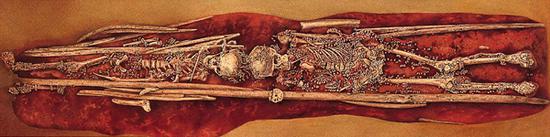 两个男孩的骸骨在俄罗斯弗拉基米尔附近的松希尔遗址内被发现。他们3.4万年前被下葬时分别是10岁和12岁。两具躯体被头对头地放置在狭长的墓穴内,伴有1万多粒象牙珠,300多颗狐狸牙齿和至少20只臂环。此外,雕刻艺术品、16只象牙矛、鹿角和两副貌似人类腓骨的物什被放置在孩子们胸骨上,填充空隙。