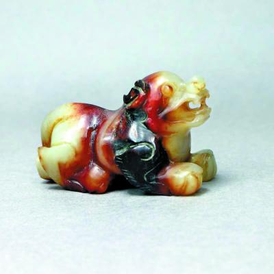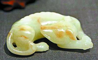 狗造型的玉器较多出现,应在汉唐以后。一是汉代佩玉多了起来,狗形象也随之出现。唐代以来,玉器不再为王室独有,逐步走向民间。玉器大量地表现出当时的民风、民俗文化。玉狗的形象也随之大量出现。大英博物馆收藏的一件圆雕唐代玉狗,做伏卧状,神态自然松弛,项下有悬挂铃铛的项圈,像是一只被驯养的家狗。宋代以后,玉器表现出更多的是民间的生活场景;狗的形象也是多姿多彩,造型不仅仅有片状的、伏卧状的,还有具体生活场景的圆雕刻画。首都博物馆收藏的童子架鹰戏犬饰件,虽然没有苏轼“左牵黄,右擎苍,锦帽貂裘,千骑卷平冈”的气势,但这件玉器造型就是当时架鹰牵狗的生活图景的展现。明清时期,狗的形象走进了文人的书房,被雕刻成了镇纸,成为文人书案上的实用器具。在豪门大家的书案、箱柜上,玉狗或坐或卧已经成为普遍的陈设器物。这一时期,玉狗形象也走进了皇宫,成为宫廷陈设与收藏品。此时期,玉狗已经登堂入室了。