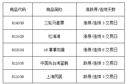 本所交易商品《三轮马套票》(代码814039)等已连续涨停多个交易日,《中国鸟台湾蓝鹊》(代码811035)等已连续跌停多个交易日,根据《湖南文化艺术品产权交易所邮币卡现货托管交易风险控制管理办法(暂行)》等相关规定,属于商品价格异常波动,本所提醒广大交易商朋友,投资有风险,入市需谨慎!