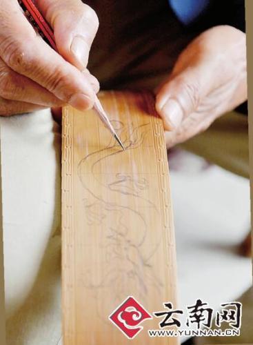 众多工序中,最难的还是雕刻,在杨春的工作室内,摆放着二三十种工具,仅自制的雕刻刀就有好几种。杨春向记者示范竹雕,一块竹料上,先用铅笔画上图案,再用雕刻刀一点点开始雕刻。