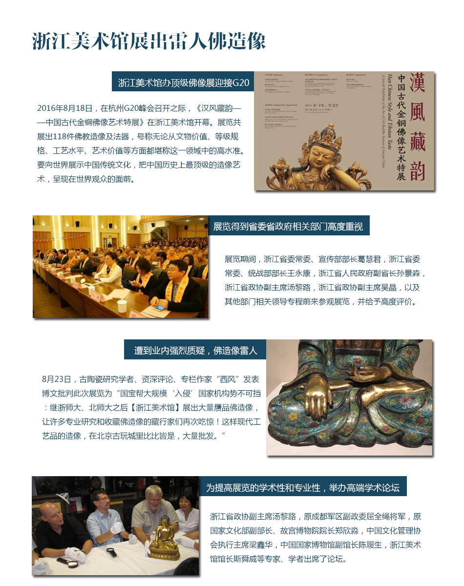 知名博主“西风”在其博文中表示,国宝帮大规模“入侵”国家机构势不可挡,继浙师大、北师大之后,浙江美术馆展出大量赝品佛造像,让许多专业研究和收藏佛造像的藏行家们再次吃惊。