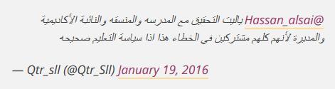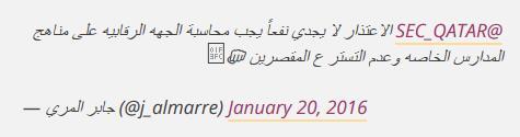 据多哈新闻报道,不少人在网络上声讨学校,有人说“道歉毫无用处,而是要负起监督学校的教学大纲和教学材料的责任。失职的人要受到惩罚。”