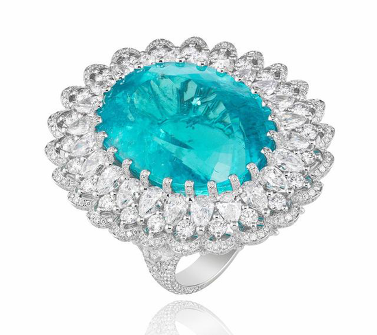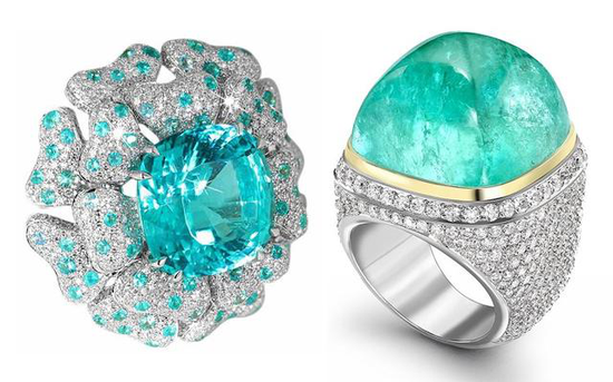 帕拉伊巴碧玺的产量非常有限,全球每月数十克拉的产出还不得不面临支离破碎,被找到的碧玺原石几乎没有完整的,那些原石的小小碎片往往只有几克,这也就是为什么即便市面上真正的帕拉伊巴碧玺通常只有0.1到0.5克拉,却还是可以卖天价的原因。所以,能亲眼见到一颗5 克拉以上的蓝色调帕拉伊巴碧玺,可是件值得庆祝和感激的事儿。